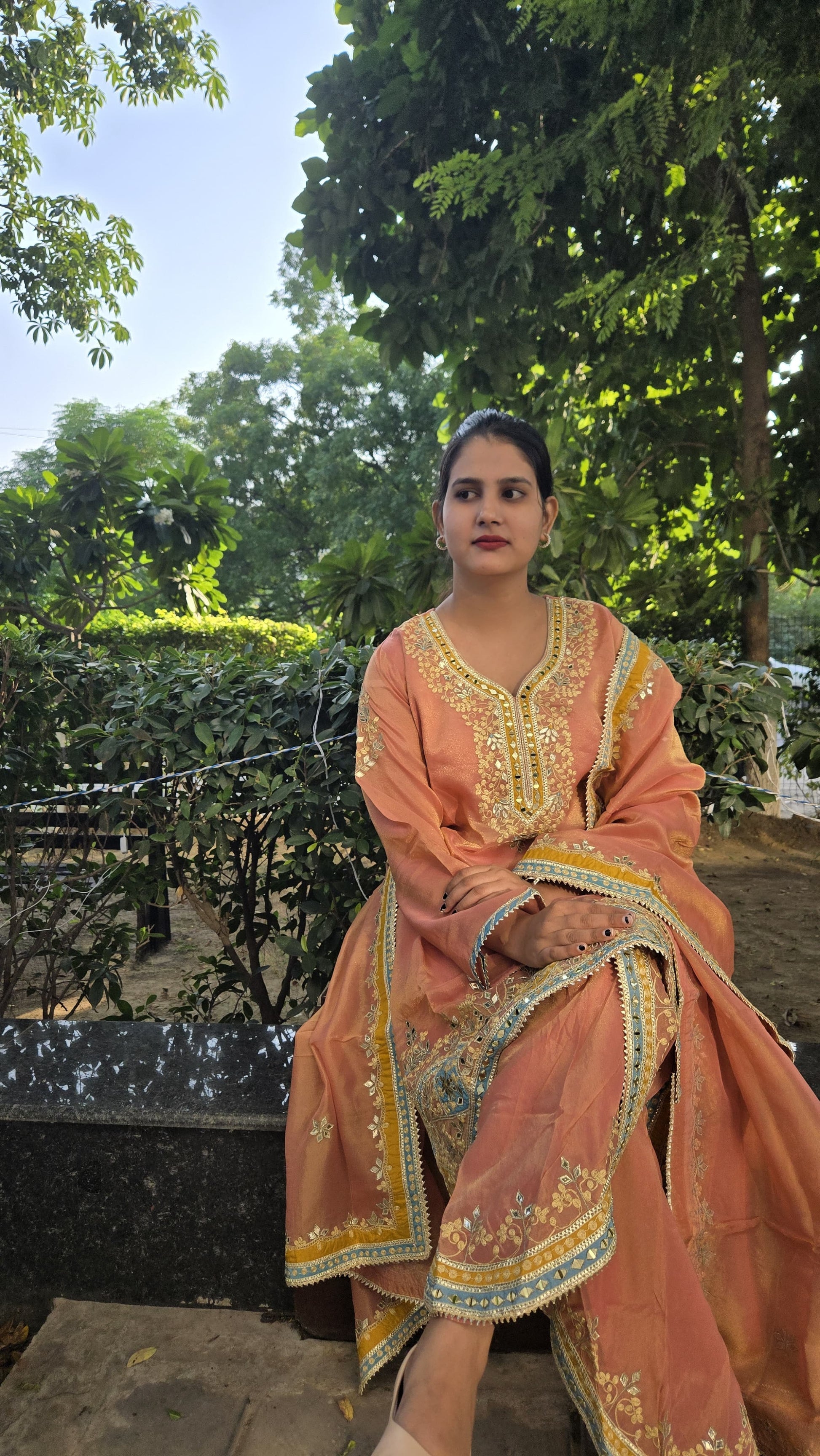 - The dupatta is beautifully crafted with multi-tone embroidered borders in golden, pink, and mustard hues, enhanced with mirror work and floral motifs for a striking look.
