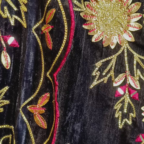 - Luxurious velvet shirt beautifully adorned with heavy thread & zari embroidery featuring floral motifs that add a royal and festive charm.