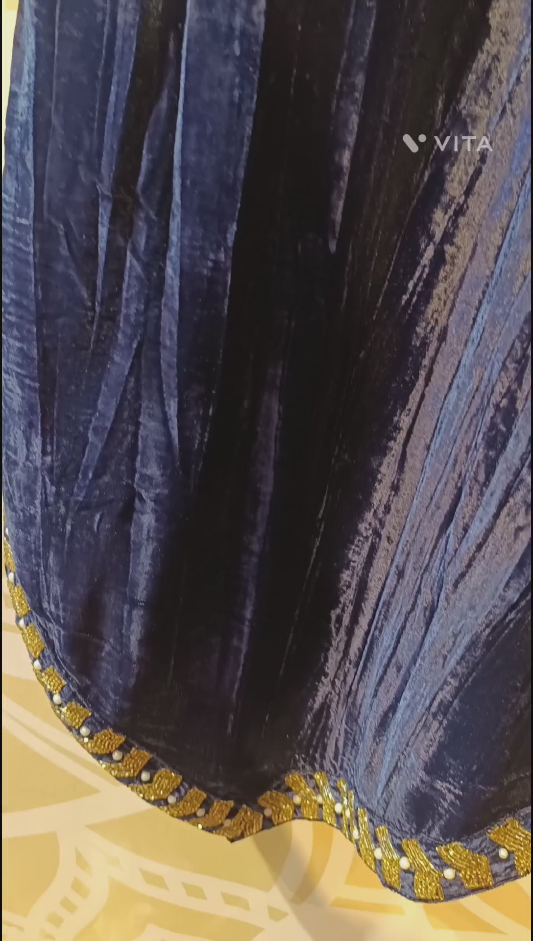 Make a statement with this elegant royal blue velvet three-piece suit, designed for a luxurious and graceful look. Crafted from soft, premium velvet fabric, the kurti features beautiful gold embellishment on the neckline and hem, adding a rich festive touch. It is paired with matching velvet pants detailed with coordinated embroidery at the cuffs. The look is completed with a lightweight, sheer dupatta featuring tassel accents, enhancing the overall elegance.