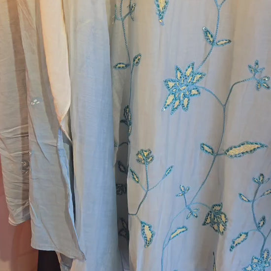 - This exquisite dual shade chanderi kurta features perfect hand embroidery at the neckline and hem, complemented by 3/4th sleeves with matching embroidery.