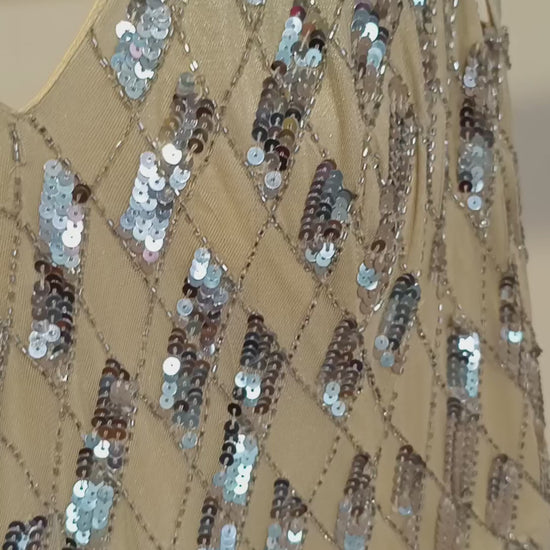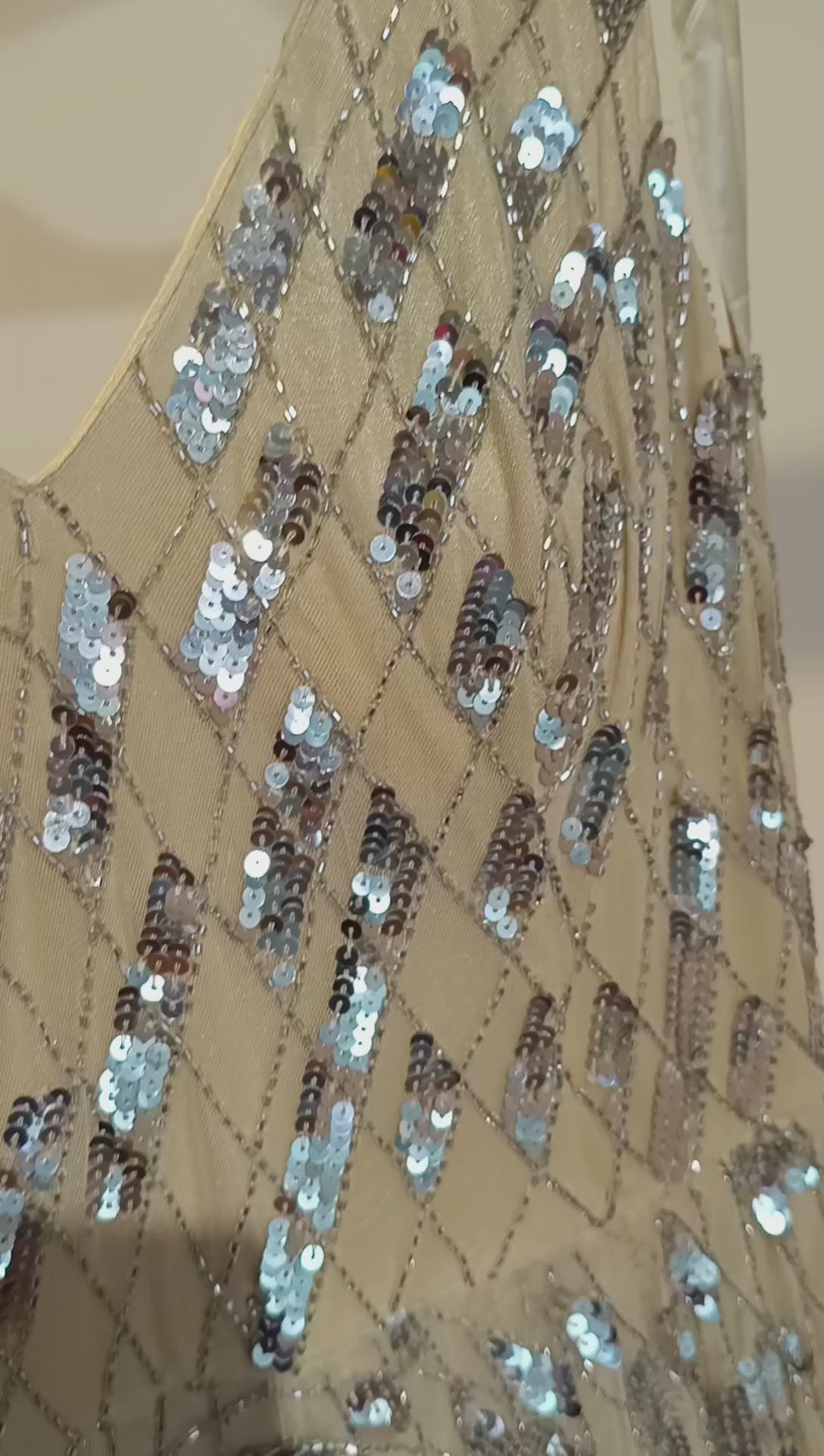 This elegant golden evening gown is adorned with a fine sequin work and delicate embroidery perfect for making a timeless statement.