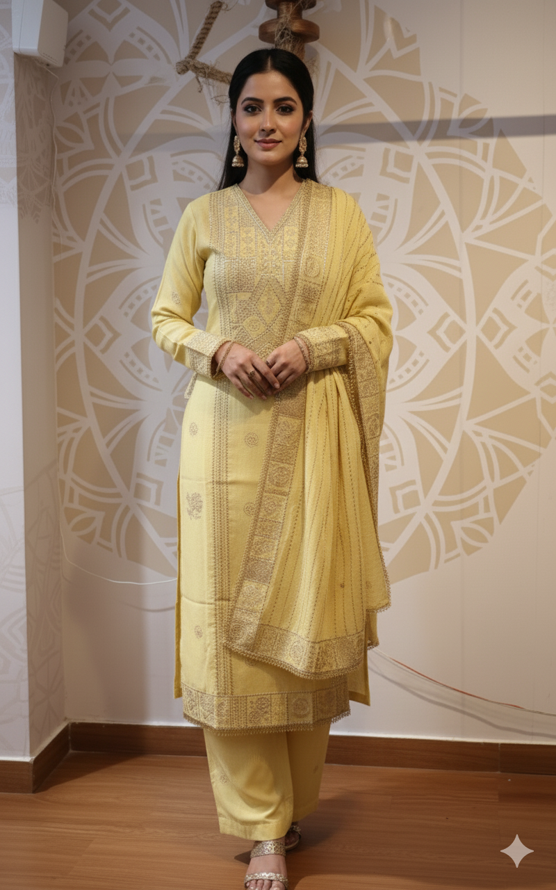 - The kurta is adorned with intricate zari and sequin embroidery, giving it a rich festive glow.